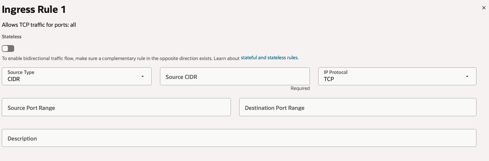 Another Ingress rule버튼을 눌러 2개의 규칙을 만들고Source CIDR에 모두 본인의 아이피/24 를 입력하고,Destination Port Range에는 각각 3306과 13306을 입력하고,Add Ingress Rules버튼을 클릭한다.