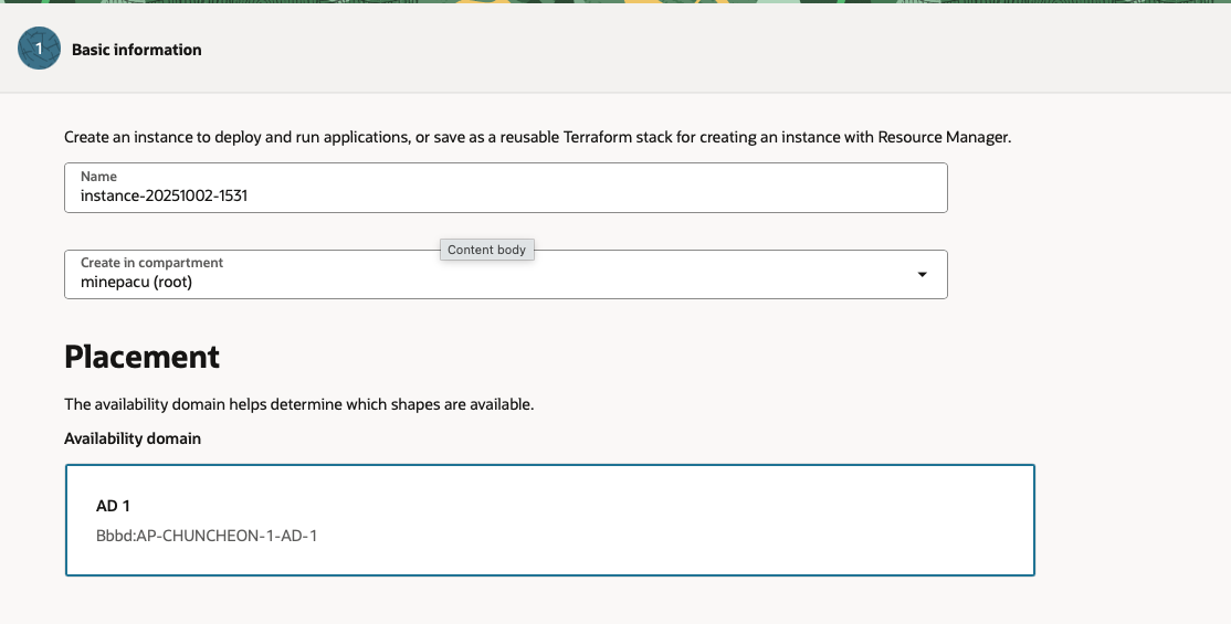 기본 정보는 본인이 원하는대로 고쳐준다. Placement는 본인이 회원 가입하는 과정에서 설정한 Region으로 고정된다.