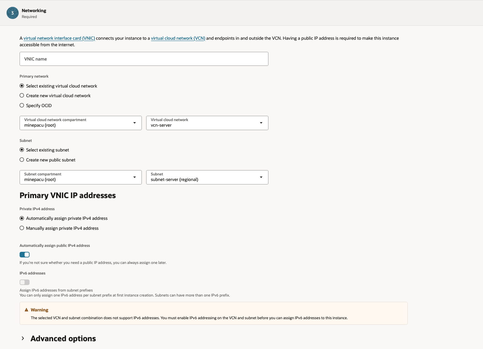 Create new virtual cloud network와 Create new public subnet를 선택하고, 이름들은 본인이 원하는대로 설정한다.